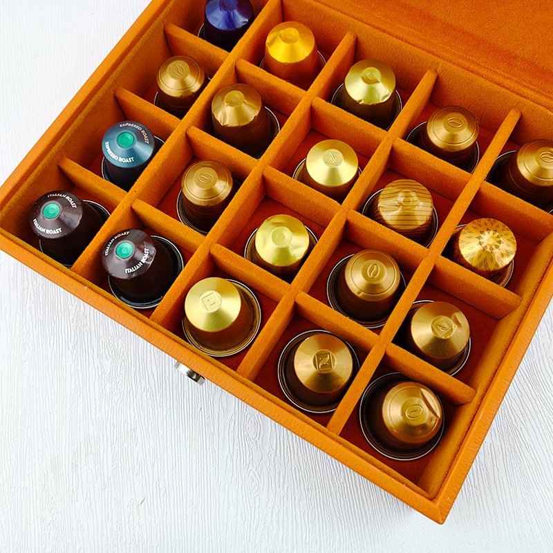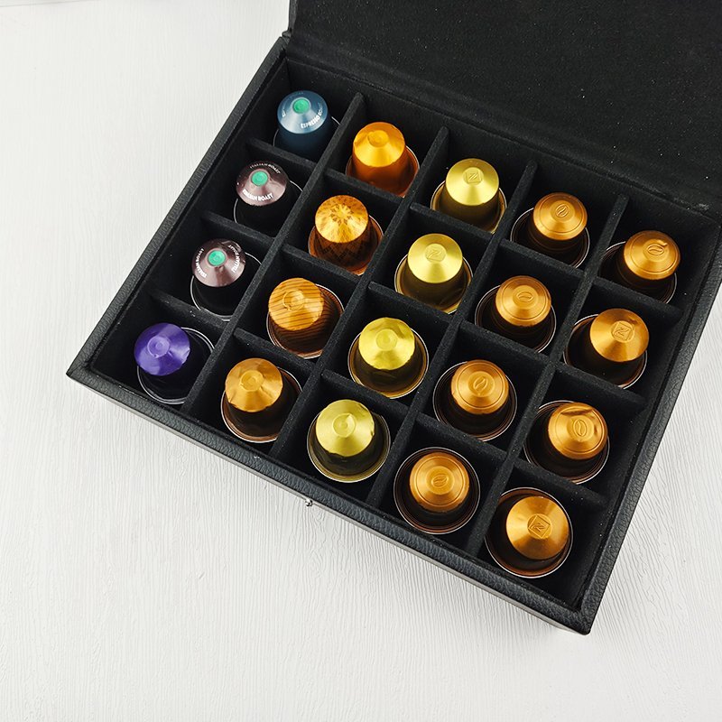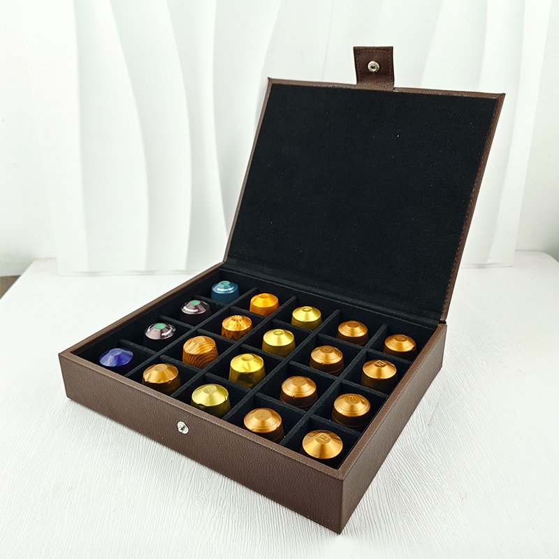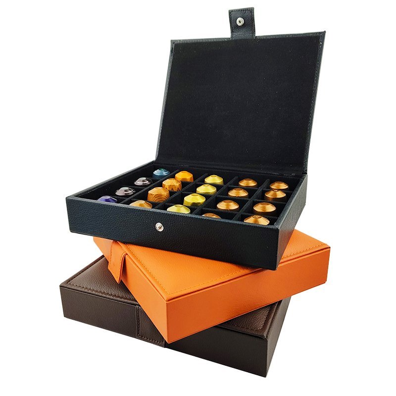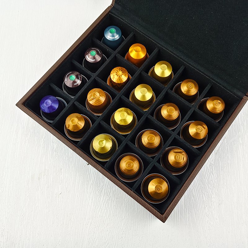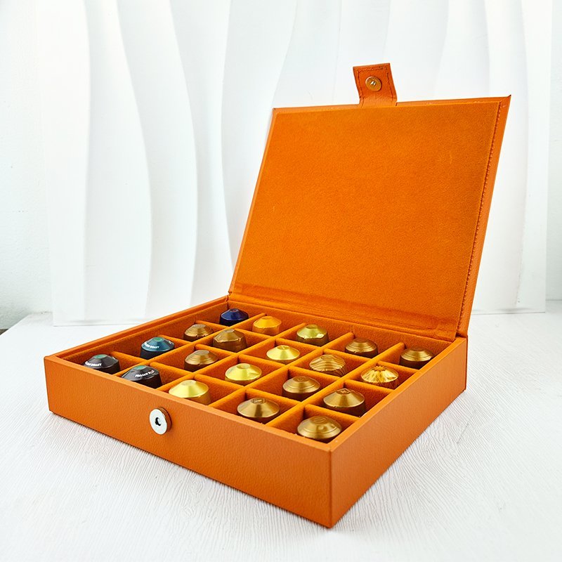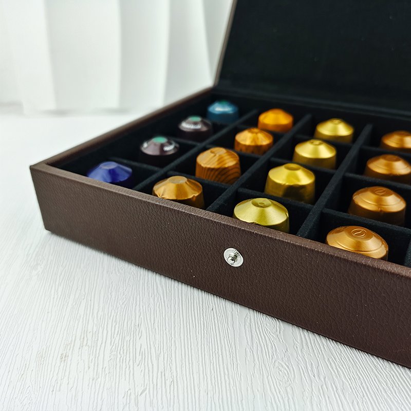 This elegant Nespresso presentation box, crafted from authentic leather, combines luxury and functionality. With its sleek design, it holds and displays up to 20 capsules, making it the perfect centerpiece to impress your guests. Whether for professional meetings, special events, or personal indulgence, this box elevates the coffee experience.